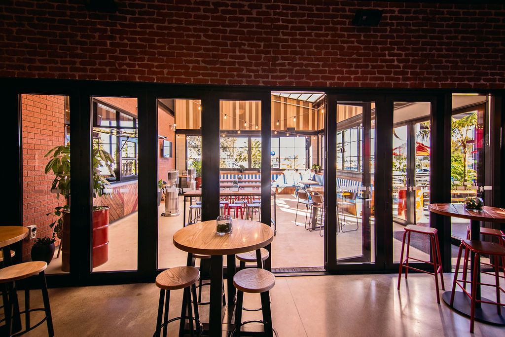 Freeport has separate spaces for ordering, eating and socializing. The internal windows and doors establish the separation. A large internal window opens on gas strut hinge allowing the window to open like a shop front awning, creating access to the shared bar behind.